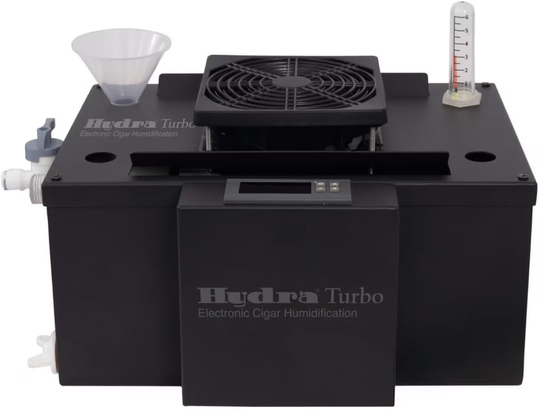 The NEW Hydra-Turbo Electronic Cigar Humidifier is the ultimate solution for maintaining ideal humidity levels in large cabinet and walk-in humidors up to 100 square feet. Perfect for both seasoned aficionados and new enthusiasts, it ensures your cigars stay fresh, flavorful, and perfectly preserved. Featuring dual directional air vents for even airflow, Hygroset adjustable calibration for precise humidity control, and real-time temperature and humidity monitoring, the Hydra-Turbo eliminates uneven humidity zones and creates a stable environment tailored to cigar preservation. With durable construction and user-friendly design, this powerful humidifier is more than just a storage accessory — it’s a reliable investment in protecting the quality and longevity of your cigar collection.