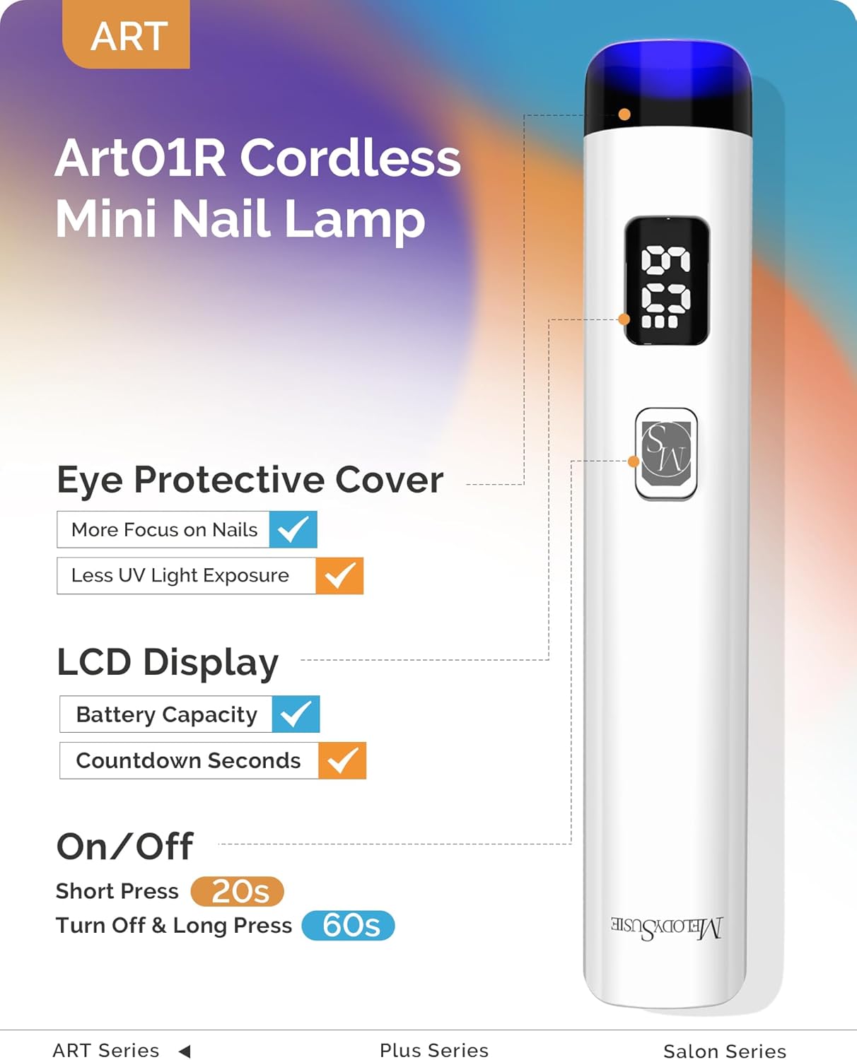 Experience a clean and efficient nail care routine with the MelodySusie Nail Dust Collector. This professional-grade, portable device features a high-power suction fan and reusable fine filter, effectively adsorbing and collecting nail dust and fly ash from 360 degrees. Its compact size (7.67 x 2.34 inches) ensures it won't clutter your workspace, while the reusable filter, easily cleaned with a hairdryer or dust brush, promotes sustainability. Additionally, the included MelodySusie Handheld UV Nail Lamp delivers five times the concentrated light, curing Rhinestone Glue, 3D Gel Nails, and decorations in just 10 to 20 seconds. The lamp's eye-protective cover safeguards your eyes while providing consistent flash curing. Powered by a 450mAh battery, this portable device offers up to 14 days of use on a single charge, making it an ideal travel companion.