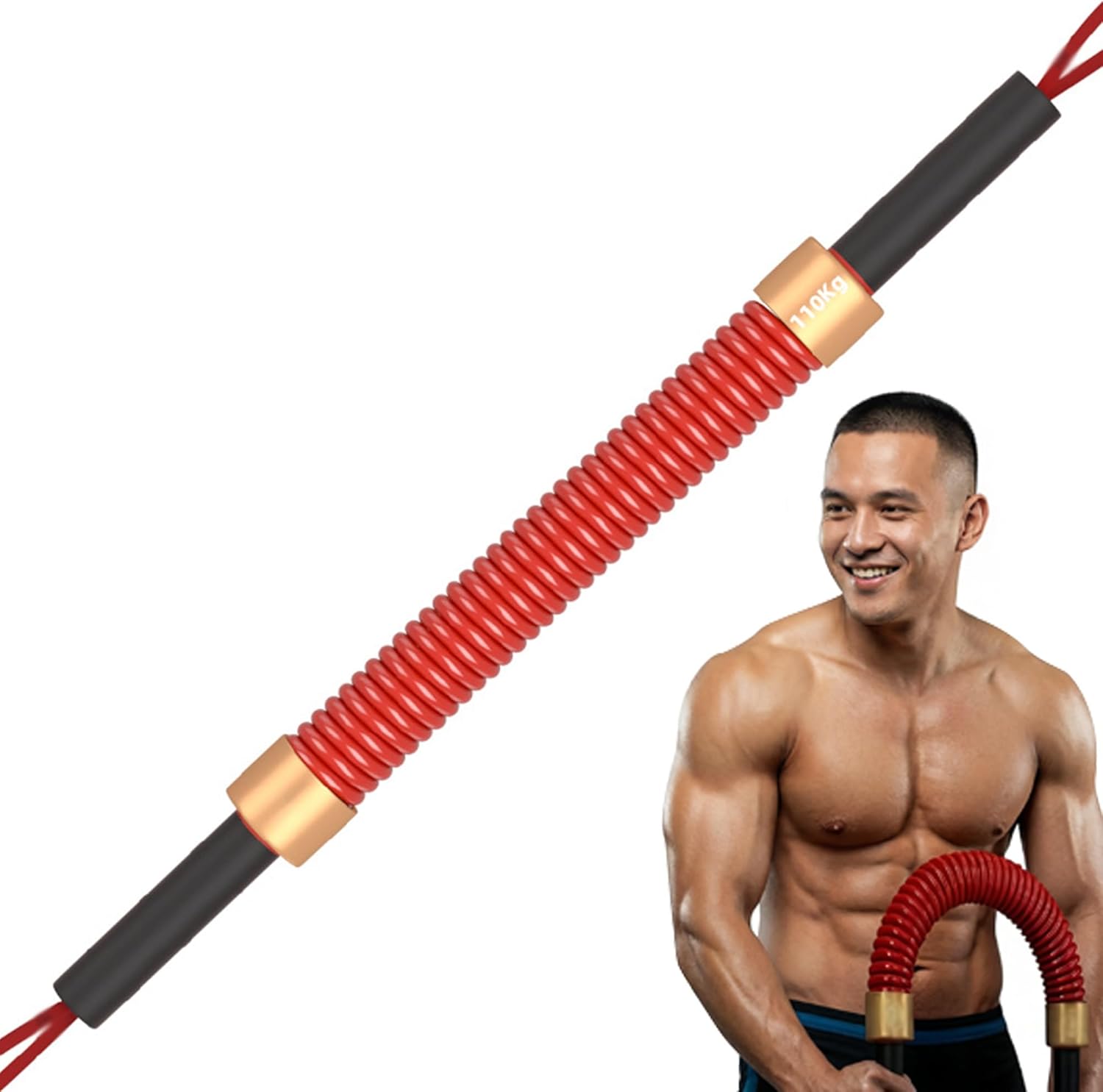 This Power Twister Bar requires significant strength from the user and is not suitable for beginners. It is designed for individuals with extensive fitness experience, particularly those engaged in professional and long-term strength training for muscle building and strength enhancement.COLOR: Red colorMATERIAL: High-strength steel spring + Rubber handle + steel tube body + ropeSIZE SPECIFICATIONS:132 lbs/60 kg, Total length 24.8 inch/63 cm, Spring outer diameter 1.68 inch/42.8 mm, Spring wire diameter 0.29 inch/7.4 mm154 lbs/70 kg, Total length 24.8 inch/63 cm, Spring outer diameter 1.71 inch/43.6 mm, Spring wire diameter 0.3 inch/7.8 mm176 lbs/80 kg, Total length 26.3 inch/66.9 cm, Spring outer diameter 1.74 inch/44.4 mm, Spring wire diameter 0.32 inch/8.2 mm198 lbs/90 kg, Total length 27 inch/68.5 cm, Spring outer diameter 1.77 inch/45.2 mm, Spring wire diameter 0.33 inch/8.6 mm220 lbs/100 kg, Total length 27.6 inch/70.3 cm, Spring outer diameter 1.81 inch/46 mm, Spring wire diameter 0.35 inch/9 mm242 lbs/110 kg, Total length 28.3 inch/72 cm, Spring outer diameter 1.84 inch/46.8 mm, Spring wire diameter 0.37 inch/9.4 mm264 lbs/120 kg, Total length 28.9 inch/73.5 cm, Spring outer diameter 1.87 inch/47.6 mm, Spring wire diameter 0.38 inch/9.8 mm286 lbs/130 kg, Total length 29.9 inch/76 cm, Spring outer diameter 2.12 inch/54 mm, Spring wire diameter 0.39 inch/10 mmHOW TO CHOOSE THE RIGHT INTENSITY LEVEL FOR YOU:Please start by choosing 132 lbs/60 kg. After a thorough warm-up, if you can complete 8-15 repetitions with proper form before reaching muscle failure, this resistance level is ideal for your current level. If you can complete more than 15 repetitions, it means it's too light, and you need to increase to 154 lbs/70 kg, and so on, choosing from 132 lbs/60 kg to 330 lbs/150 kg.APPLICABLE OCCASIONS: Home, Office, Gym, OutdoorTRAINING AREAS: arm, Upper Body, shoulder, chest, bicep, forearm, back PACKAGE CONTENTS: Red Power Twister Bar x1