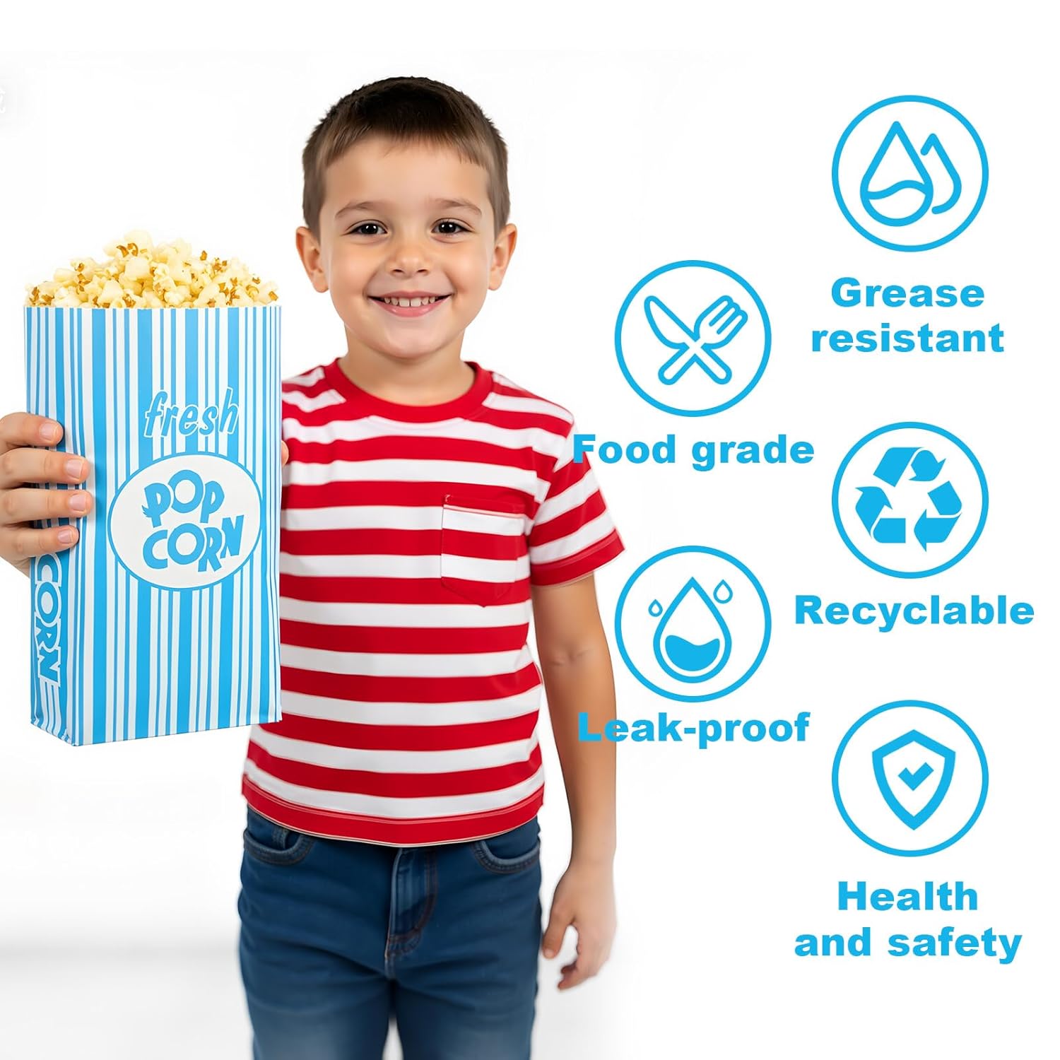 Features: Disposable popcorn containers are suitable for home, schools, food trucks, concession stands, restaurants, birthday parties, weddings, carnivals, picnics, BBQ or stadiums, theaters, any indoor and outdoor events. These movie popcorn containers are disposable, making cleaning after your picnic or party simpler easier and time saving. Specifications: Material: oil proof paper Color: white, blue Size: about 23 x 13 x 6 cm / 9.1 x 5.1 x 2.4 inches Package includes: 200 x Flat bottom popcorn bags Notes: Manual measurement, please allow slight errors on size. The color may exist a slight difference due to different screen displays.