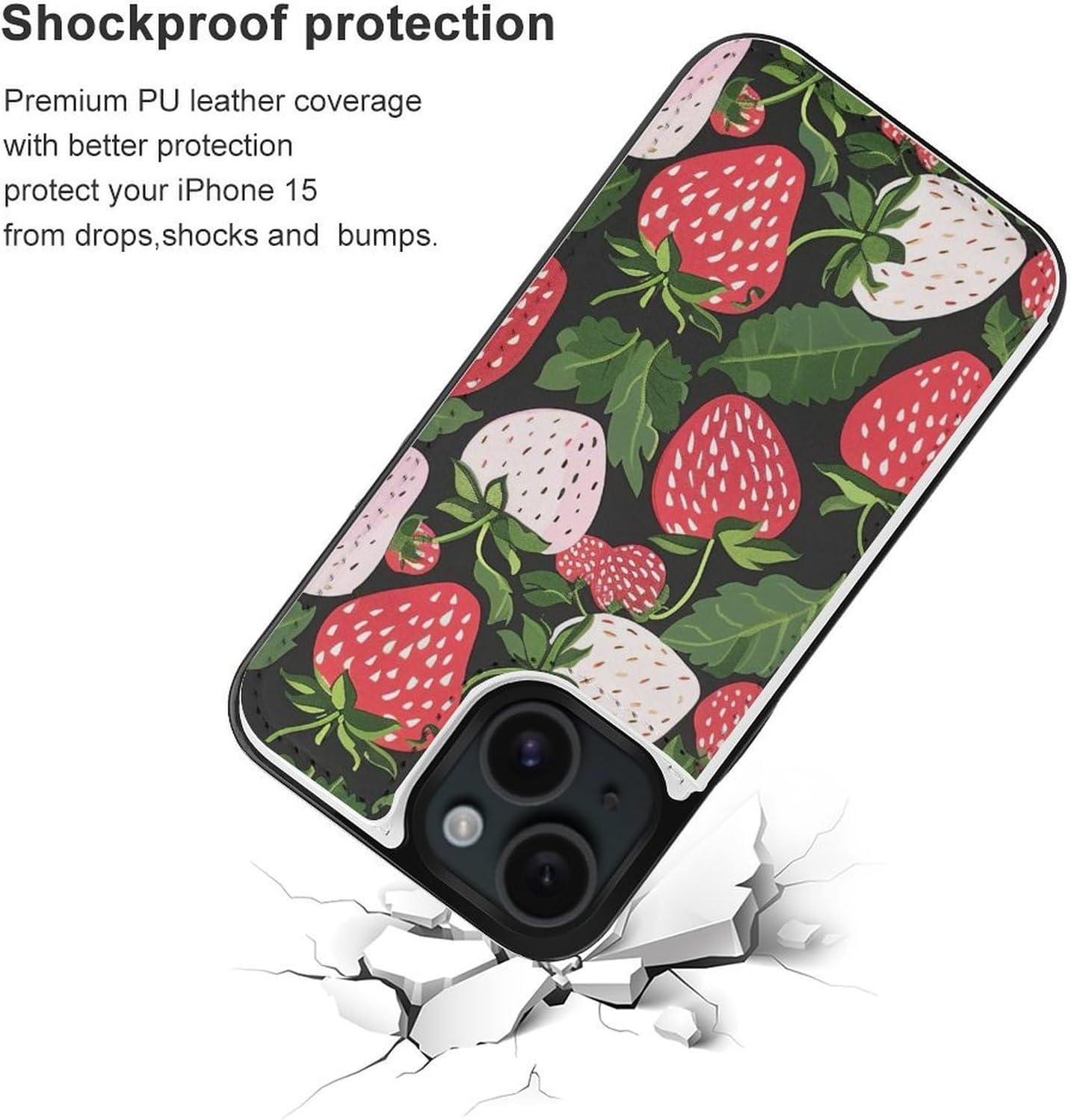 Upgrade your wallet case for iPhone 15 phone case to be fashion! Our [Strawberry Print] Print Flip Phone Case merges luxury and utility, featuring a PU leather exterior with fade-resistant pattern print that exudes sophistication. The shockproof TPU inner shell absorbs impacts from all angles, while the full-wrap soft edges ensure a snug, scratch-free fit.Simplify Your Daily Routine:Carry cards, IDs, and cash securely in the card holder - no more fumbling for wallets at checkout lines or airport security. The magnetic closure snaps shut firmly, ideal for tossing into beach bags, gym totes, or briefcases without spills.Designed for Active Lifestyles:The lightweight, slim build slips easily into pockets or purses, while the built-in kickstand transforms your phone into a mini theater for streaming workouts, virtual meetings, or road trip playlists. Precision-cut openings provide seamless access to buttons, speakers, and charging ports. Dose not support wireless charging (remove the case for charging).